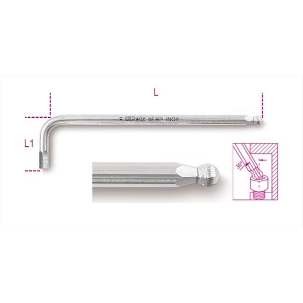 Features -96BP Inox 6-Ball Head Offset Hexagon Key Wrenches -Made of Stainless Steel -High resistance to corrosion -Outstanding mechanical characteristics -Avoids improper rust -Ball head makes it possible to work at angle of up to 30 degree to screw axis -For tightening use short side if possible -Material Type - I -L Size - 154 mm. -L1 Size - 36 mm.
