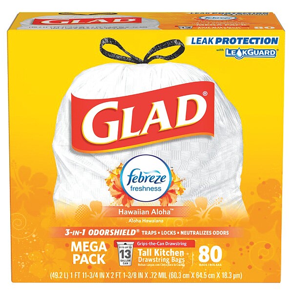 Trash Bag, Capacity 13 gal, Trash Bag Material LLDPE, Thickness 0.95 mil, Color White, Bag Closure Type Drawstring, Width 24 in, Height 27 1/2 in, Max. Load 25 lb, Bottom Seal Type Flat, Scent Hawaiian Aloha, Legend No Legend, Package Configuration Coreless Roll, Bags per Roll 80, Rolls per Package 1, Item Trash Bag, Application Kitchen, Package Quantity 80