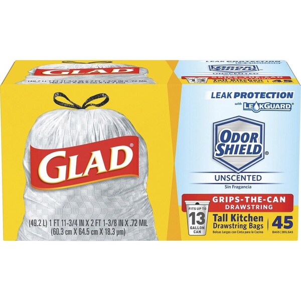 Keep your trash contained with the durability and quality of these Glad Tall Kitchen Drawstring Trash bags. ForceFlex technology gives extra flex as it expands around sharp edges and heavy loads to let you pack it in without ripping. Dual-layered construction with RipGuard and LeakGuard technology resists punctures, rips and tears, and the seepage of liquids. The Durable Grips-The-Can drawstring ensures that the bag stays in place and provides a three-ply handle to easily lift, carry and toss the bag.