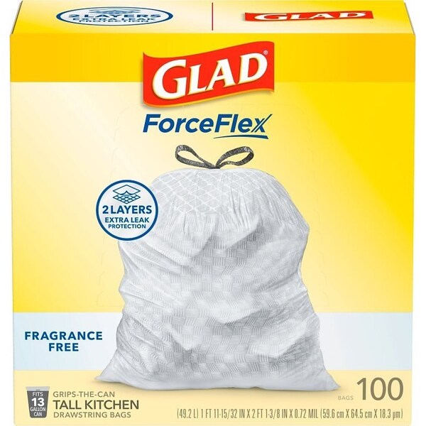 Glad Force Flex trash bags feature leak protection with RipGuard and LeakGuard protection.