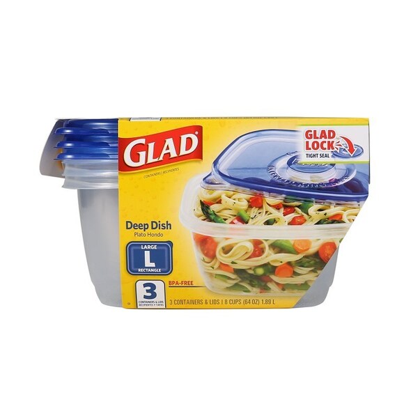 Glad Large Deep Dish, 64 oz, Rectangular, Plastic, Clear, Lid Type: Interlocking, Seal Tight, Lid Color: Blue, Lid Material: Plastic
