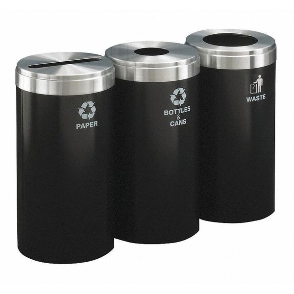 30 gal Round Recycling Bin, Open Top, Satin Black/Satin Aluminum, 3 Openings