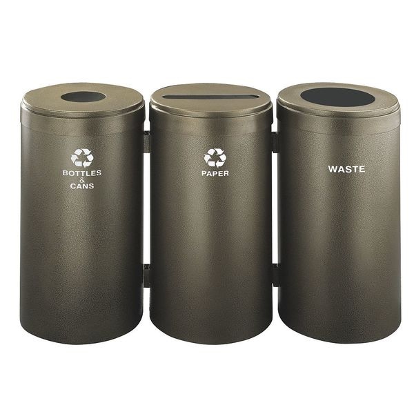 69 gal Round Recycling Bin, Open Top, Bronze Vein, Steel, 3 Openings