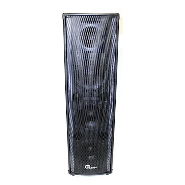 This great sounding speaker system with integrated crossover uses four drivers, two 8-in woofers, one 8-in midrange and one high frequency driver to create spectacular sounds. It also uses four tuned ports to help manage base response. Combine that with a full feature light show and this is something truly special. Includes standard size pole mount hole on bottom or use the rubber feet to floor stand the speaker. Integrated MP3 Media player, Media player for playing MP3 songs via USB, SD or Bluetooth technology. LED Show mode control knob options: OFF: Turn the light off., Mood: The lights will light up solidly., Meter: The column of Iights will simulate a digital volume., Mix: The lights willl ight up according to the frequency spectrum of the audio signal. Bass frequencies will produce more red light. Mid-range frequencies will produce more green Iight. Treble frequencies will produce more blue light. , Pulse: The audio signal will cause the lights to pulse with one color determined by the color select knob with their brightness determined by the light knob. Party: When the color select knob is fully counter clockwise, the LEDs cycle rapidly through a pre-programmed dynamic show of colors and meter levels. Turn the color select knob clockwise from this position to change to a slower continuous cycle of solid colors. Turn the color select knob further clockwise to slow down how quickly the colors change. Light brightness control. Level Mic / Line 1: Volume control for the microphone or line 1 input. Level Player/ Line 2: Volume control for the player and line 2 input. Treble control for high tone control. Bass control for low tone control. MIC / Line 1 Input: XLR jack input for connecting microphone or audio source with line level output e.g. mixer, CD player RCA Line 2 Input: RCA jack input or connecting audio source with line level output e.g. mixer, CD player Jack 3.5mm Line 2 Input, Link output: XLR jack output for connecting another active loudspeaker. Player/ Line 2 Switch: selects between Player or line 2 input. LED Power indicator Dimensions: 10.5-in Width, 9.5-in Depth, 36.25-in height. Mounts to standard pole mount like the model: GLI-PRO SST-18.