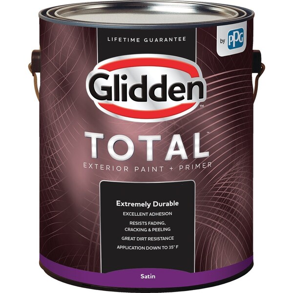 Glidden Total exterior paint + primer is extremely durable and offers protection in all climates season after season. With low temperature application and excellent adhesion you dont have to wait for warm weather to get the job done. This paint resists fading cracking and peeling and has great dirt resistance so it stays cleaner longer while giving you enduring beauty and protection for your home.