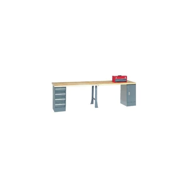 EXTRA LONG INDUSTRIAL BENCH CABINET/4 DRAWER PEDESTAL WITH LEG - SAFETY EDGE SHOP TOP THE ANSWER FOR THOSE LOOKING FOR THE ULTIMATE IN DURABILITY AND VALUE. THIS MULTI-PURPOSE BENCH HAS A 2-1/4" THICK TOP THAT IS WARP RESISTANT, DURABLE AND LONG LASTING. STRINGER BRACED HEAVY-DUTY STEEL LEGS GUARANTEE RIGIDITY AND STABILITY. PEDESTALS ARE 15-3/4"W X 20"D.SHOP TOP HIGH DENSITY HARD LUMBER CORE IS SURROUNDED WITH 62 LB. DENSITY CUSTOM RESIN BOARD. 144"W BENCHES INCLUDE TWO 72"W TOPS. OVERALL HEIGHT IS 34-1/4". IDEAL FOR SHIPPING, ASSEMBLY AND MAINTENANCE JOBS.