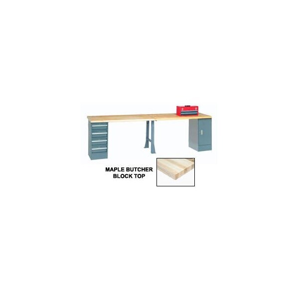 144"W X 30"D PRODUCTION WORKBENCH - MAPLE BUTCHER BLOCK,CABINET, 4 DRAWER, 1 LEG, GRAY THESE EXTRA LONG WORKBENCHES ARE BUILT WITH DURABILITY IN MIND. BENCH PEDESTALS ARE 15-3/4"W X 20"D X 32"H FEATURING FULL LENGTH ALUMINUM DRAWER PULLS AND SMOOTH GLIDING NYLON ROLLERS. INSIDE DRAWER DIMENSION ARE 13"W X 17-3/4"D X 5-1/2"H. MAPLE BUTCHER BLOCK - KILN DRIED 1-3/4" THICK HARDWOOD, MINERAL OIL SEALED. DOUBLE ELECTRICAL KNOCKOUTS ON LEGS. 144"W BENCHES INCLUDE (2) 72"W TOPS, (1) CABINET, (3) DRAWERS AND (1) LEG FRAME.