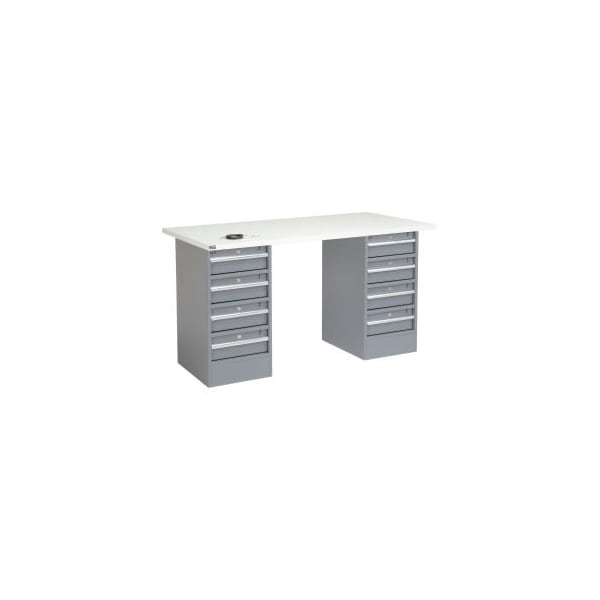 PREMIUM PEDESTAL WORKBENCHES 72"W X 30"D WORKBENCH WITH 1-1/4 THICK SQUARE EDGE ESD TOP 4 DRAWER/4 DRAWER PEDESTAL WORKBENCH IS MADE WITH STRONG, ALL WELDED STEEL THAT WITHSTANDS TOUGH INDUSTRIAL ENVIRONMENTS, AND PROVIDES STORAGE FOR ANY APPLICATION. PEDESTAL DRAWERS OFFER SMOOTH DRAWER OPERATION USING NYLON ROLLERS AND FULL-LENGTH ALUMINUM HANDLES. ALL DRAWERS INDIVIDUALLY LOCK USING CYLINDER LOCKS FOR SECURE STORAGE. INSIDE DRAWER DIMENSIONS ARE 13"W X 17-3/4"D X 5-1/2"H. GRAY POWDER COAT FINISH. OVERALL PEDESTAL DIMENSIONS ARE 15-3/4"W X 20"D X 32"H.