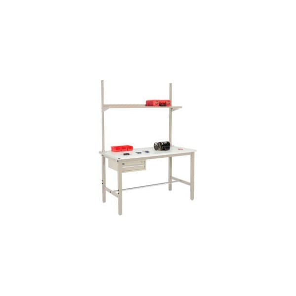 PRODUCTION WORKBENCH ESD LAMINATE SQUARE EDGE W/ DRAWER, UPRIGHT & SHELF TAN 72"W X 30"D THESE PRODUCTION BENCHES OFFER THE SAME HIGH QUALITY CONSTRUCTION AS OUR HEAVY DUTY BENCHES BUT WITH THE ADDED CONVENIENCE OF LOCKING STACKABLE DRAWERS. HIGH QUALITY INDUSTRIAL WORK BENCH IS BUILT TO LAST USING RUGGED 2" X 2" X 14 GAUGE TUBULAR STEEL HEIGHT ADJUSTABLE LEGS. LEGS ADJUST AT 2" INCREMENTS. THESE WORKBENCHES ARE TESTED TO 5,000 LB. CAPACITY. 6"H DRAWER CAN BE MOUNTED TO EITHER LEFT OR RIGHT HAND SIDE UNDER THE COUNTER TOP FOR LOCKABLE STORAGE. SECURES VALUABLE TOOLS, SUPPLIES AND MORE USING A CYLINDER LOCK WITH 2 KEYS. DRAWER RUNS SMOOTH ON NYLON ROLLERS. BASE INCLUDES A SET OF ADJUSTABLE LEVELING FLOOR GLIDES AND A SET OF LEVELING FOOT PLATES THAT ALLOW FLOOR ANCHORING. POWDER COAT FINISH. QUICK AND EASY ASSEMBLY.