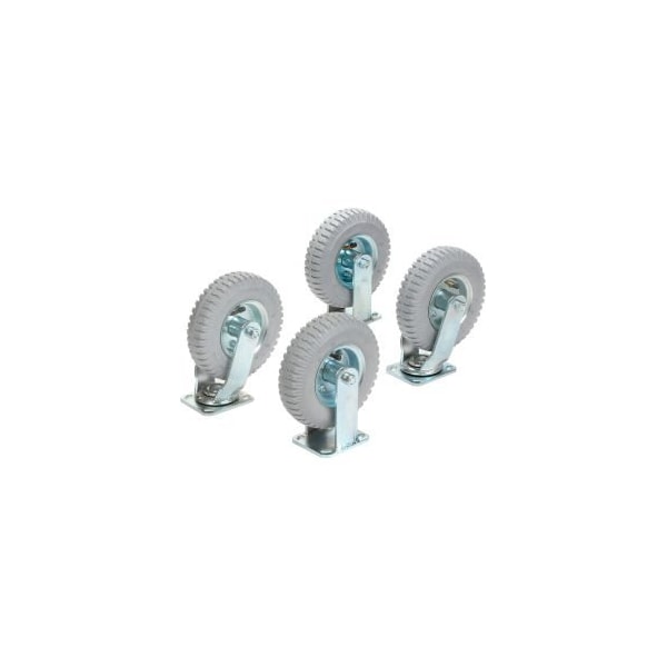 FULL PNEUMATIC CASTER KIT INCLUDES 2 SWIVEL AND 2 RIGID CASTERS TRANSPORT DELICATE PARTS AND MATERIALS VIRTUALLY ON AIR. SHOCK-ABSORBING, FULL PNEUMATIC TIRED, ROLLER BEARING WHEEL ABSORBS VIBRATIONS WHICH COULD BE HARMFUL TO LOAD, WHILE PROTECTING FLOORS. CORROSION-RESISTANT ELECTROPLATED CASTERS PROVIDE YEARS OF DEPENDABLE SERVICE. GRAY RUBBER TIRES.