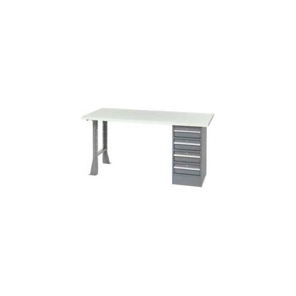 PREMIUM PEDESTAL WORKBENCHES 96" W X 30" D PEDESTAL WORKBENCH W/ 4 DRAWERS & OPEN LEG, PLASTIC LAMINATE SQUARE EDGE - GRAY THESE OPEN LEG WORKBENCHES ARE MADE OF A STEEL BASE CONSTRUCTION WITH A PLASTIC LAMINATE SQUARE EDGE TOP FOR LONG LASTING DURABILITY. WORKBENCH PROVIDES 4 DRAWERS FOR STORAGE CONVENIENCE. PLASTIC LAMINATE SQUARE EDGE TOP ADDS EASY MAINTENANCE IN WORKING ENVIRONMENTS. AVAILABLE COLOR IS GRAY.