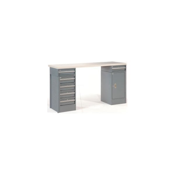 THIS CABINET WORKBENCH IS IDEAL FOR VARIOUS WORK SPACE ENVIRONMENTS AND APPLICATIONS INCLUDING GARAGES, WORKSHOPS, MAINTENANCE OFFICES AND MORE. IT SECURES SUPPLIES AND TOOLS WITH HEAVY DUTY STEEL PEDESTAL WORKBENCHES. THE STANDARD 5 DRAWER/CABINET WORKBENCH COMES WITH TWO STATIONARY PEDESTAL BASES, 60"W X 24"D X 1-5/8" THICK PLASTIC LAMINATE BENCH TOP AND PEGBOARD END CAPS FOR HANGING TOOLS. THE DRAWER PEDESTAL FEATURE FULL-WIDTH ALUMINUM DRAWER PULLS, NYLON ROLLERS FOR SMOOTH OPERATION AND INDIVIDUAL CYLINDER LOCKS. THE CABINET PEDESTALS FEATURE A RECESSED HANDLE, CYLINDER LOCK AND AN ADJUSTABLE SHELF.