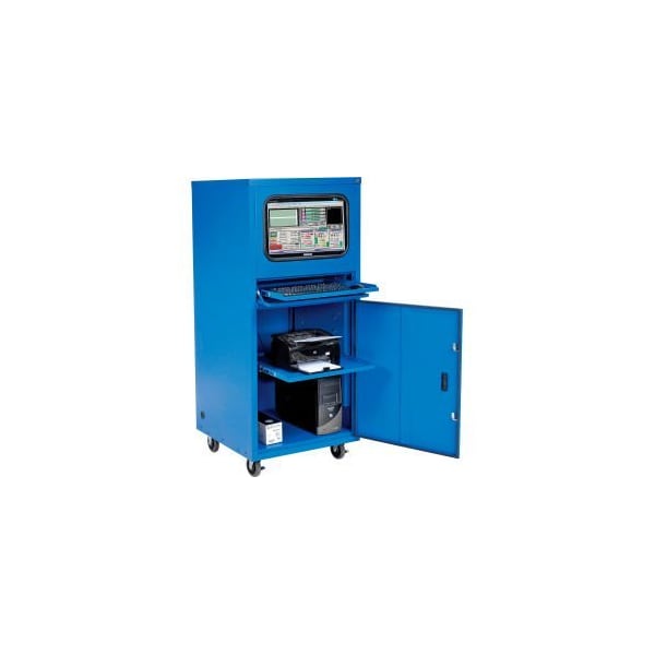 GECTM DELUXE MOBILE SECURITY COMPUTER CABINET - BLUE - ASSEMBLED THIS HEAVY DUTY UNIT PROVIDES SECURE STORAGE FOR ALL YOUR COMPUTER HARDWARE. RUGGED 12 AND 16 GAUGE STEEL WITH CHANNEL FORMED REINFORCEMENTS FOR ADDED STRENGTH. UPPER COMPARTMENT FEATURES A BREAK RESISTANT ACRYLIC WINDOW AND ACCOMMODATES LCD OR CRT MONITORS UP TO 27" DIAGONAL. LOWER COMPARTMENT INCLUDES ONE 23"W X 26"D HEIGHT ADJUSTABLE SLIDE OUT SHELF AT 2" INCREMENTS. FEATURES INCLUDE LOCKABLE 24-1/4"W X 22"D SLIDE-OUT KEYBOARD/MOUSE TRAY WITH FULL EXTENSION DRAWER GLIDES. CABLE MANAGEMENT GROMMET. LOCKING ACCESS DOORS IN FRONT AND REAR WITH 2 CYLINDER LOCKS EACH, ALL LOCKS KEYED ALIKE. FULL ACCESS DOOR IN REAR ALLOWS FOR EASY WIRING AND IS LOUVERED FOR VENTILATION. FILTERED AIR INTAKE FAN TO COOL HARDWARE WHILE KEEPING OUT DUST AND DEBRIS WITH FOAM SEALS ON ALL DOORS. NON-MARKING HEAVY DUTY 5"CASTERS (2 SWIVEL WITH BRAKE, 2 RIGID). BLUE POWDER COAT FINISH. PURCHASE THE OPTIONAL 23U EIA RACK KIT TO MOUNT ROUTERS, SERVERS AND SWITCHES IN BOTTOM COMPARTMENT (HARDWARE INCLUDED). UPPER FRAME CONSISTS OF: 24 GAUGE PANELS, 19 GAUGE SLIDING KEYBOARD/MOUSE TRAY. LOWER FRAME CONSISTS OF: 23 GAUGE DOOR & DOOR FRAME, 23 GAUGE SIDE & BOTTOM PANELS, 20 GAUGE DRAWER THICKNESS. SHIPS FULLY ASSEMBLED. DIMENSIONS: