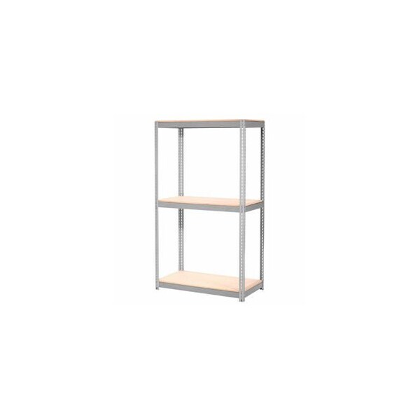 MODULAR BULK STORAGE RACK STARTER UNIT WITH WOOD DECKING - 3 LEVELS EASY TO EXPAND AND ASSEMBLE. BOLTLESS DESIGN SNAPS TOGETHER SECURELY WITHOUT TOOLS OR HARDWARE. OPEN DESIGN ALLOWS ACCESS FROM ALL SIDES. ROLL FORMED 14 GAUGE STEEL UPRIGHTS ENSURE RIGIDITY. LEVELS INCLUDE RUGGED 5/8" THICK PARTICLEBOARD DECKING AND ADJUST AT 1-1/2" INCREMENTS WITHOUT DISASSEMBLY. SCRATCH RESISTANT ENAMEL FINISH. THIS STARTER UNIT INCLUDES 4 UPRIGHT ANGLE POSTS, 3 SETS OF HORIZONTAL BEAMS AND PARTICLEBOARD DECKING. ADD-ON UNITS INCLUDE 2 T-POSTS TO MAKE EXPANSION EASY AND JOIN UNITS WITH MORE STABILITY AND LESS CONSTRUCTION THAN BOLTING 2 STARTER UNITS TOGETHER.