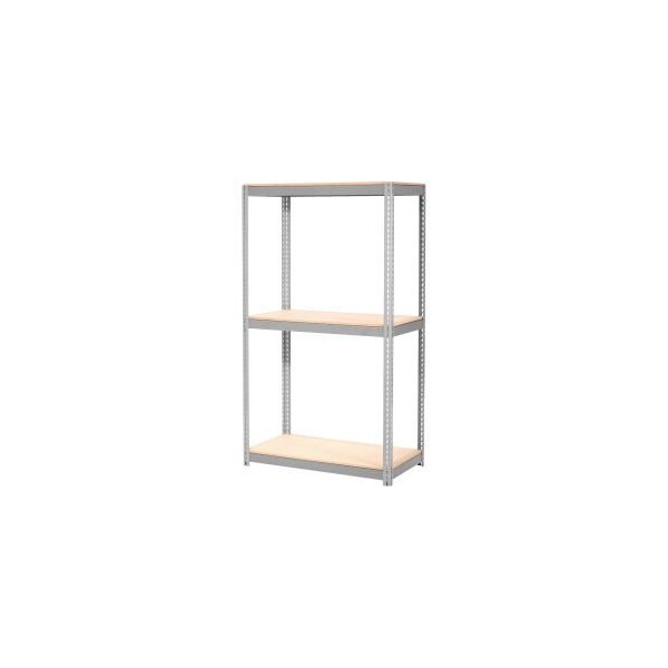 EXPANDABLE STARTER RACK GRAY WITH 3 LEVEL WOOD DECK 1000LB CAP PER DECK 60"W X 48"D X 84"H EASY TO EXPAND AND ASSEMBLE. BOLTLESS DESIGN SNAPS TOGETHER SECURELY WITHOUT TOOLS OR HARDWARE. OPEN DESIGN ALLOWS ACCESS FROM ALL SIDES. ROLL FORMED 14 GAUGE STEEL UPRIGHTS ENSURE RIGIDITY. LEVELS INCLUDE RUGGED 5/8" THICK PARTICLEBOARD DECKING AND ADJUST AT 1-1/2" INCREMENTS WITHOUT DISASSEMBLY. SCRATCH RESISTANT ENAMEL FINISH. THIS STARTER UNIT INCLUDES 4 UPRIGHT ANGLE POSTS, 3 SETS OF HORIZONTAL BEAMS AND PARTICLEBOARD DECKING. ADD-ON UNITS INCLUDE 2 T-POSTS TO MAKE EXPANSION EASY AND JOIN UNITS WITH MORE STABILITY AND LESS CONSTRUCTION THAN BOLTING 2 STARTER UNITS TOGETHER.