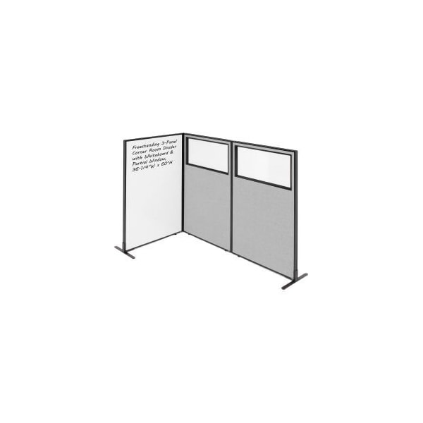 FREESTANDING 3-PANEL CORNER ROOM DIVIDER WITH WHITEBOARD & PARTIAL WINDOW, 74-1/4"W X 60"H, GRAY SECTION YOUR OFFICE SPACE WITH INTERION® BY GEC PARTITION PANELS . WHETHER YOU NEED TO CONTAIN NOISE, ENCLOSE AN OFFICE DESK OR BLOCK OFF A COPY MACHINE, THESE ROOM DIVIDERS WILL MAKE IT EASY AND AFFORDABLE. OFFICE PARTITION PANELS WITH WHITEBOARD CAN BE USED IN CONJUNCTION WITH OTHER INTERION® PANELS TO WRAP AROUND EXISTING DESKS AND OFFICE FURNITURE TO CREATE PRIVATE OFFICE SPACES FOR ANY OFFICE ENVIRONMENT. 1-3/4" THICK PANEL FEATURES FULL PAINTED METAL MAGNETIC WHITEBOARDS ON BOTH SIDES TO ALLOW YOU TO ADD WRITING SPACE ON ANY CUBICLE WALL. PANEL TRIM IS FINISHED WITH SELF-EXTINGUISHING EXTRUDED POLYMER THAT OFFERS OPTIMUM SAFETY AND RIGIDITY. INCLUDES 1 PARTITION PANEL WITH WHITEBOARD, 2 PARTITION PANELS WITH 5MM THICK POLYCARBONATE WINDOW, STEEL T-LEGS FOR STABILITY AND ALL THE NECESSARY HARDWARE TO CREATE A 90 DEGREE CORNER CONFIGURATION. TRANSLUCENT WINDOWS ALLOW LIGHT IN WHILE STILL MAINTAINING PRIVACY, BRINGING AN ELEGANT AND UPSCALE LOOK TO ANY OFFICE.