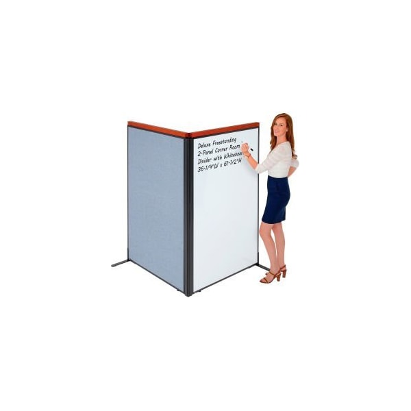 DELUXE FREESTANDING 2-PANEL CORNER ROOM DIVIDER WITH WHITEBOARD, 38"W X 61-1/2"H, BLUE SECTION YOUR OFFICE SPACE WITH INTERION® BY GEC PARTITION PANELS. WHETHER YOU NEED TO CONTAIN NOISE, ENCLOSE AN OFFICE DESK OR BLOCK OFF A COPY MACHINE, THESE ROOM DIVIDERS WILL MAKE IT EASY AND AFFORDABLE. OFFICE PARTITION PANELS WITH WHITEBOARD CAN BE USED IN CONJUNCTION WITH OTHER INTERION® PANELS TO WRAP AROUND EXISTING DESKS AND OFFICE FURNITURE TO CREATE PRIVATE OFFICE SPACES FOR ANY OFFICE ENVIRONMENT. 1-3/4" THICK PANEL FEATURES FULL PAINTED METAL MAGNETIC WHITEBOARDS ON BOTH SIDES TO ALLOW YOU TO ADD WRITING SPACE ON ANY CUBICLE WALL. PANEL TRIM IS FINISHED WITH SELF-EXTINGUISHING EXTRUDED POLYMER THAT OFFERS OPTIMUM SAFETY AND RIGIDITY. INCLUDES 1 FABRIC PANEL AND 1 WHITEBOARD PANEL, STEEL T-LEGS FOR STABILITY AND ALL THE NECESSARY HARDWARE TO CREATE A 90 DEGREE CORNER CONFIGURATION. DELUXE VERSIONS INCLUDE A WOOD CAP IN CHERRY FINISH TO ELEVATE YOUR OFFICE LOOK.