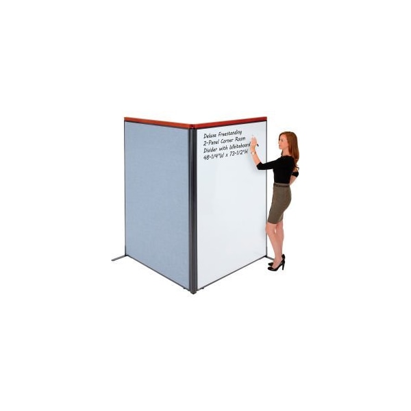 DELUXE FREESTANDING 2-PANEL CORNER ROOM DIVIDER WITH WHITEBOARD, 50"W X 73-1/2"H, BLUE SECTION YOUR OFFICE SPACE WITH INTERION® BY GEC PARTITION PANELS. WHETHER YOU NEED TO CONTAIN NOISE, ENCLOSE AN OFFICE DESK OR BLOCK OFF A COPY MACHINE, THESE ROOM DIVIDERS WILL MAKE IT EASY AND AFFORDABLE. OFFICE PARTITION PANELS WITH WHITEBOARD CAN BE USED IN CONJUNCTION WITH OTHER INTERION® PANELS TO WRAP AROUND EXISTING DESKS AND OFFICE FURNITURE TO CREATE PRIVATE OFFICE SPACES FOR ANY OFFICE ENVIRONMENT. 1-3/4" THICK PANEL FEATURES FULL PAINTED METAL MAGNETIC WHITEBOARDS ON BOTH SIDES TO ALLOW YOU TO ADD WRITING SPACE ON ANY CUBICLE WALL. PANEL TRIM IS FINISHED WITH SELF-EXTINGUISHING EXTRUDED POLYMER THAT OFFERS OPTIMUM SAFETY AND RIGIDITY. INCLUDES 1 FABRIC PANEL AND 1 WHITEBOARD PANEL, STEEL T-LEGS FOR STABILITY AND ALL THE NECESSARY HARDWARE TO CREATE A 90 DEGREE CORNER CONFIGURATION. DELUXE VERSIONS INCLUDE A WOOD CAP IN CHERRY FINISH TO ELEVATE YOUR OFFICE LOOK.