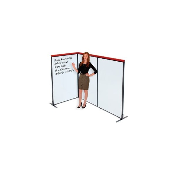 DELUXE FREESTANDING 3-PANEL CORNER ROOM DIVIDER WITH WHITEBOARD, 74-1/4"W X 61-1/2"H SECTION YOUR OFFICE SPACE WITH INTERION® BY GEC PARTITION PANELS. WHETHER YOU NEED TO CONTAIN NOISE, ENCLOSE AN OFFICE DESK OR BLOCK OFF A COPY MACHINE, THESE ROOM DIVIDERS WILL MAKE IT EASY AND AFFORDABLE. OFFICE PARTITION PANELS WITH WHITEBOARD CAN BE USED IN CONJUNCTION WITH OTHER INTERION® PANELS TO WRAP AROUND EXISTING DESKS AND OFFICE FURNITURE TO CREATE PRIVATE OFFICE SPACES FOR ANY OFFICE ENVIRONMENT. 1-3/4" THICK PANEL FEATURES FULL PAINTED METAL MAGNETIC WHITEBOARDS ON BOTH SIDES TO ALLOW YOU TO ADD WRITING SPACE ON ANY CUBICLE WALL. PANEL TRIM IS FINISHED WITH SELF-EXTINGUISHING EXTRUDED POLYMER THAT OFFERS OPTIMUM SAFETY AND RIGIDITY. INCLUDES 3 PARTITION PANELS WITH WHITEBOARD, STEEL T-LEGS FOR STABILITY AND ALL THE NECESSARY HARDWARE TO CREATE A 90 DEGREE CORNER CONFIGURATION. DELUXE VERSIONS INCLUDE A WOOD CAP IN CHERRY FINISH TO ELEVATE YOUR OFFICE LOOK.