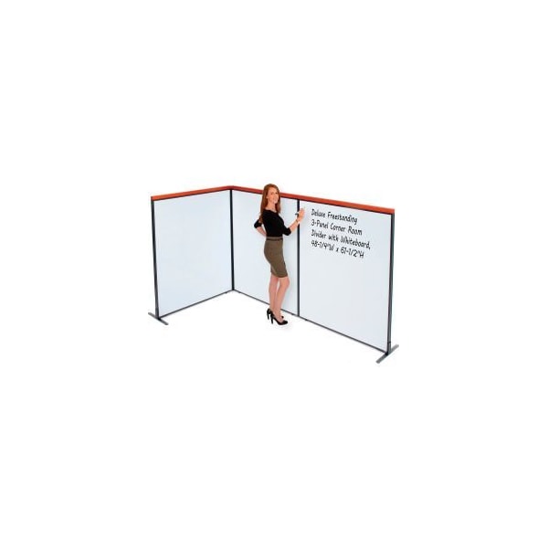 DELUXE FREESTANDING 3-PANEL CORNER ROOM DIVIDER WITH WHITEBOARD, 98-1/4"W X 61-1/2"H SECTION YOUR OFFICE SPACE WITH INTERION® BY GEC PARTITION PANELS. WHETHER YOU NEED TO CONTAIN NOISE, ENCLOSE AN OFFICE DESK OR BLOCK OFF A COPY MACHINE, THESE ROOM DIVIDERS WILL MAKE IT EASY AND AFFORDABLE. OFFICE PARTITION PANELS WITH WHITEBOARD CAN BE USED IN CONJUNCTION WITH OTHER INTERION® PANELS TO WRAP AROUND EXISTING DESKS AND OFFICE FURNITURE TO CREATE PRIVATE OFFICE SPACES FOR ANY OFFICE ENVIRONMENT. 1-3/4" THICK PANEL FEATURES FULL PAINTED METAL MAGNETIC WHITEBOARDS ON BOTH SIDES TO ALLOW YOU TO ADD WRITING SPACE ON ANY CUBICLE WALL. PANEL TRIM IS FINISHED WITH SELF-EXTINGUISHING EXTRUDED POLYMER THAT OFFERS OPTIMUM SAFETY AND RIGIDITY. INCLUDES 3 PARTITION PANELS WITH WHITEBOARD, STEEL T-LEGS FOR STABILITY AND ALL THE NECESSARY HARDWARE TO CREATE A 90 DEGREE CORNER CONFIGURATION. DELUXE VERSIONS INCLUDE A WOOD CAP IN CHERRY FINISH TO ELEVATE YOUR OFFICE LOOK.