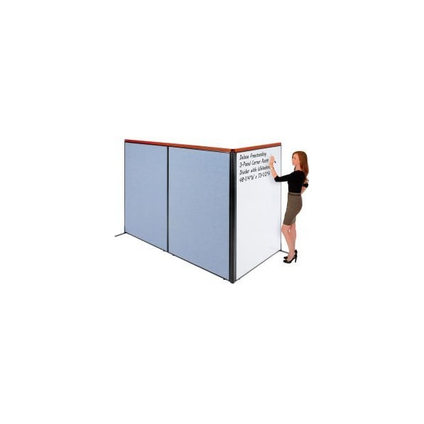 DELUXE FREESTANDING 3-PANEL CORNER ROOM DIVIDER WITH WHITEBOARD, 98-1/4"W X 73-1/2"H, BLUE SECTION YOUR OFFICE SPACE WITH INTERION® BY GEC PARTITION PANELS. WHETHER YOU NEED TO CONTAIN NOISE, ENCLOSE AN OFFICE DESK OR BLOCK OFF A COPY MACHINE, THESE ROOM DIVIDERS WILL MAKE IT EASY AND AFFORDABLE. OFFICE PARTITION PANELS WITH WHITEBOARD CAN BE USED IN CONJUNCTION WITH OTHER INTERION® PANELS TO WRAP AROUND EXISTING DESKS AND OFFICE FURNITURE TO CREATE PRIVATE OFFICE SPACES FOR ANY OFFICE ENVIRONMENT. 1-3/4" THICK PANEL FEATURES FULL PAINTED METAL MAGNETIC WHITEBOARDS ON BOTH SIDES TO ALLOW YOU TO ADD WRITING SPACE ON ANY CUBICLE WALL. PANEL TRIM IS FINISHED WITH SELF-EXTINGUISHING EXTRUDED POLYMER THAT OFFERS OPTIMUM SAFETY AND RIGIDITY. INCLUDES 2 FABRIC PANELS AND 1 WHITEBOARD PANEL, STEEL T-LEGS FOR STABILITY AND ALL THE NECESSARY HARDWARE TO CREATE A 90 DEGREE CORNER CONFIGURATION. DELUXE VERSIONS INCLUDE A WOOD CAP IN CHERRY FINISH TO ELEVATE YOUR OFFICE LOOK.