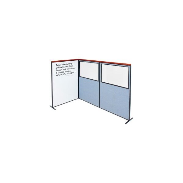 DELUXE FREESTANDING 3-PANEL CORNER ROOM DIVIDER WITH WHITEBOARD & PARTIAL WINDOW, 98-1/4"W X 73-1/2"H, BLUE SECTION YOUR OFFICE SPACE WITH INTERION® BY GEC PARTITION PANELS. WHETHER YOU NEED TO CONTAIN NOISE, ENCLOSE AN OFFICE DESK OR BLOCK OFF A COPY MACHINE, THESE ROOM DIVIDERS WILL MAKE IT EASY AND AFFORDABLE. OFFICE PARTITION PANELS WITH WHITEBOARD CAN BE USED IN CONJUNCTION WITH OTHER INTERION® PANELS TO WRAP AROUND EXISTING DESKS AND OFFICE FURNITURE TO CREATE PRIVATE OFFICE SPACES FOR ANY OFFICE ENVIRONMENT. 1-3/4" THICK PANEL FEATURES FULL PAINTED METAL MAGNETIC WHITEBOARDS ON BOTH SIDES TO ALLOW YOU TO ADD WRITING SPACE ON ANY CUBICLE WALL. PANEL TRIM IS FINISHED WITH SELF-EXTINGUISHING EXTRUDED POLYMER THAT OFFERS OPTIMUM SAFETY AND RIGIDITY. INCLUDES 1 PARTITION PANEL WITH WHITEBOARD, 2 PARTITION PANELS WITH 5MM THICK POLYCARBONATE WINDOW, STEEL T-LEGS FOR STABILITY AND ALL THE NECESSARY HARDWARE TO CREATE A 90 DEGREE CORNER CONFIGURATION. TRANSLUCENT WINDOWS ALLOW LIGHT IN WHILE STILL MAINTAINING PRIVACY, BRINGING AN ELEGANT AND UPSCALE LOOK TO ANY OFFICE. DELUXE VERSIONS INCLUDE A WOOD CAP IN CHERRY FINISH TO ELEVATE YOUR OFFICE LOOK.