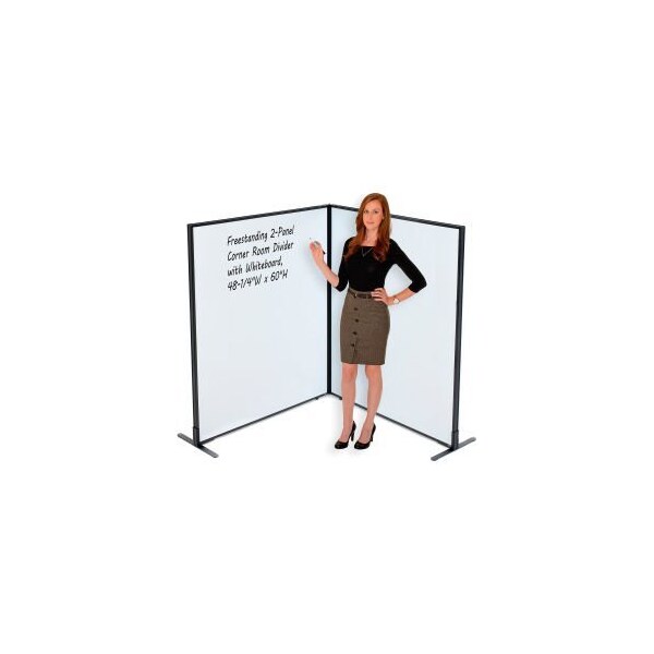 FREESTANDING 2-PANEL CORNER ROOM DIVIDER WITH WHITEBOARD, 50"W X 60"H SECTION YOUR OFFICE SPACE WITH INTERION® BY GEC PARTITION PANELS . WHETHER YOU NEED TO CONTAIN NOISE, ENCLOSE AN OFFICE DESK OR BLOCK OFF A COPY MACHINE, THESE ROOM DIVIDERS WILL MAKE IT EASY AND AFFORDABLE. OFFICE PARTITION PANELS WITH WHITEBOARD CAN BE USED IN CONJUNCTION WITH OTHER INTERION® PANELS TO WRAP AROUND EXISTING DESKS AND OFFICE FURNITURE TO CREATE PRIVATE OFFICE SPACES FOR ANY OFFICE ENVIRONMENT. 1-3/4" THICK PANEL FEATURES FULL PAINTED METAL MAGNETIC WHITEBOARDS ON BOTH SIDES TO ALLOW YOU TO ADD WRITING SPACE ON ANY CUBICLE WALL. PANEL TRIM IS FINISHED WITH SELF-EXTINGUISHING EXTRUDED POLYMER THAT OFFERS OPTIMUM SAFETY AND RIGIDITY. INCLUDES 2 PARTITION PANELS WITH WHITEBOARD, STEEL T-LEGS FOR STABILITY AND ALL THE NECESSARY HARDWARE TO CREATE A 90 DEGREE CORNER CONFIGURATION.