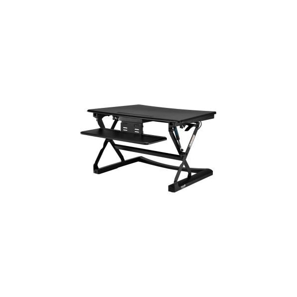 INTERION® HEIGHT ADJUSTABLE SIT-STAND DESK CONVERTER WITH RETRACTABLE KEYBOARD THE INTERION® BY GEC HEIGHT ADJUSTABLE SIT-STAND DESK CONVERTER HAS A 35" WIDE PLATFORM WITH A RETRACTABLE KEYBOARD TRAY. THE WORK SURFACE OVER THE RETRACTABLE KEYBOARD TRAY CAN SUPPORT LAPTOPS AS WELL. THE INTERION®'S STANDING DESK CONVERTER PROVIDES AN EASY WAY TO TRANSITION BETWEEN SITTING AND STANDING THROUGHOUT THE WORKDAY. THE HEIGHT ADJUSTABLE SIT-STAND DESK CONVERTER OFFERS SMOOTH UP/DOWN MOTION AND THE 35"W X 23-1/2"D PLATFORM CAN RAISE AND LOWER IN VARIOUS INCREMENTS FROM 6" TO 20" IN HEIGHT. THE 25-1/4"W X 9"D RETRACTABLE KEYBOARD TRAY RESTS CLOSE TO YOUR DESK IN THE SITTING POSITION TO MAINTAIN ERGONOMIC POSTURE. THE PLATFORM ON THE SIT-STAND DESK CONVERTER HAS AMPLE SURFACE AREA TO SUPPORT TWO 21" MONITORS AND THE GAS-LIFT SPRINGS ARE OPTIMIZED FOR THE TOTAL PERIPHERAL WEIGHT OF 33 LBS. INCLUDING THE KEYBOARD. CONVENIENT TABLET STAND BUILT INTO PLATFORM. CABLE MANAGEMENT INCLUDED. COMES PRE-ASSEMBLED WITH REMOVABLE KEYBOARD TRAY DETACHED.