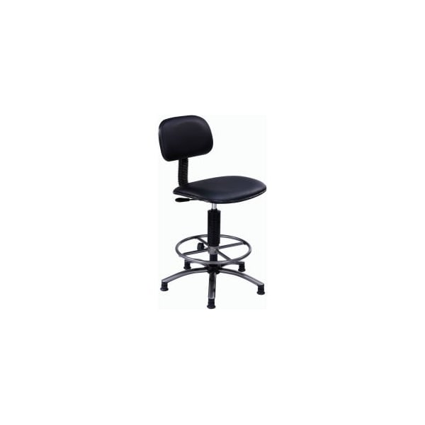 INTERION® SWIVEL STOOL BLACK VINYL 25 - 29" SEAT FEATURES 2-1/2" THICK PADDING WITH PNEUMATIC HEIGHT ADJUSTMENT. CONTOURED BACK HAS 1" THICK PADDING AND MOVES IN AND OUT ON A FLOATING HINGE FOR COMFORTABLE SUPPORT. CHAIR SWIVELS 360° TO PUT WORK WITHIN REACH. FOOTREST ADJUSTS FROM 8-1/4" TO 11-1/2"H. DURABLE BLACK VINYL UPHOLSTERY. NON-MARRING NYLON FLOOR GLIDES. OPTIONAL CASTERS INCREASE CHAIR HEIGHT 2-1/2". SEAT MEASURE 19-1/2"W X 18-1/2"D. BACK MEASURES 16"W X 10"H. BRAND IS INTERION® BY GEC. SEAT ADJUSTS FROM 25" TO 29"H.
