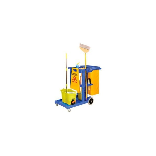 GLOBALTM BLUE JANITORIAL CART THIS HIGH-DENSITY PLASTIC JANITORIAL CART HOLDS EVERYTHING, IS EASY-TO-CLEAN AND WITHSTANDS CONSTANT HEAVY USE. WITH 3 STURDY SHELVES, MOP AND BROOM HOLDERS AND A FRONT PLATFORM THAT HOLDS A 20 GALLON WASTE CAN OR MOST MOP BUCKETS, THIS JANITORIAL CART IS FULLY FEATURED TO SAVE TIME AND EFFORT. RUGGED 25 GALLON ZIPPERED VINYL BAG PERMITS EASY EMPTYING AND ATTACHES SECURELY TO CART; HINGED LID COVERS VINYL BAG TO HIDE WASTE OR LAUNDRY COLLECTION. MOLDED-IN GRIP HANDLE AND LARGE 8" REAR WHEELS AND 3" FRONT SWIVEL CASTERS ALLOW EASY MANEUVERABILITY, EVEN IN TIGHT AREAS. CART MEASURES 48-1/2"L X 20"W X 39"H. SHELF DIMENSIONS - BOTTOM 32" X 18" X 2", MIDDLE 12-1/2" X 15" X 2", TOP 12-1/2" X 15" X 3". WRINGER BUCKET AND SUPPLIES SOLD SEPARATELY. ALSO AVAILABLE IN GRAY AND BLACK. "