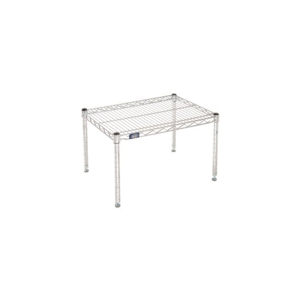 NEXEL® P1824C CHROME WIRE SHELF PLATFORM, 24"W X 18"D X 14"H PLATFORMS KEEP MERCHANDISE OFF FLOOR AND CLEARLY VISIBLE. IDEAL FOR STOCK ROOM. 14"H PLATFORM CONSISTS OF FOUR POSTS, ONE SHELF, PLASTIC SHELF CLIPS, AND ADJUSTABLE FLOOR LEVELERS. CHROME PLATING PROCESS CONSISTS OF ELECTRO-PLATED NICKEL-CHROME RESULTING IN A BRILLIANT HIGH GLOSS FINISH. OPEN WIRE TRUSS REINFORCED SHELVES FEATURE FRONT TO BACK WELDED SURFACE RIBS FOR ADDED STRENGTH. OPEN DESIGN MAXIMIZES AIR AND LIGHT CIRCULATION AND MINIMIZES DUST ACCUMULATION. IN DRY APPLICATION AND USAGE.