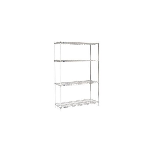 NEXEL® CHROME WIRE SHELVING ADD-ON - 48"W X 18"DX 74"H ADD-ON SHELVING UNITS ALLOW UNIT EXPANSION TO MAKE THE MOST OF STORAGE SPACE. INCLUDES 2 POSTS WITH LEVELING FEET, 4 SHELVES, SNAP-ON SLEEVES AND S-HOOKS TO JOIN UNITS. CHROME PLATED FINISH IS ATTRACTIVE ENOUGH FOR RETAIL DISPLAY, BUT WITHSTANDS WAREHOUSE CONDITIONS AS WELL. FEATURES: