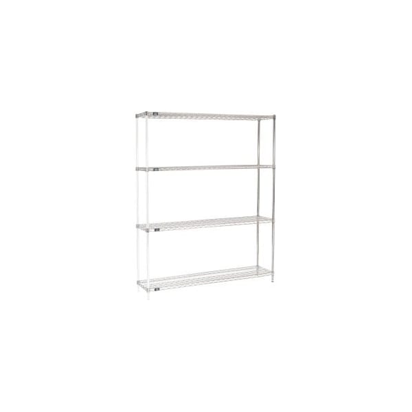 NEXEL® CHROME WIRE SHELVING ADD-ON - 60"W X 14"DX 74"H ADD-ON SHELVING UNITS ALLOW UNIT EXPANSION TO MAKE THE MOST OF STORAGE SPACE. INCLUDES 2 POSTS WITH LEVELING FEET, 4 SHELVES, SNAP-ON SLEEVES AND S-HOOKS TO JOIN UNITS. CHROME PLATED FINISH IS ATTRACTIVE ENOUGH FOR RETAIL DISPLAY, BUT WITHSTANDS WAREHOUSE CONDITIONS AS WELL. FEATURES: