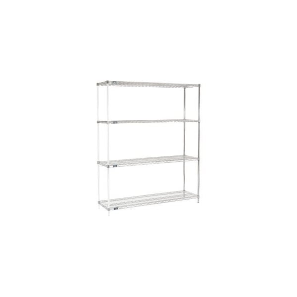 NEXEL® CHROME WIRE SHELVING ADD-ON - 60"W X 18"DX 74"H ADD-ON SHELVING UNITS ALLOW UNIT EXPANSION TO MAKE THE MOST OF STORAGE SPACE. INCLUDES 2 POSTS WITH LEVELING FEET, 4 SHELVES, SNAP-ON SLEEVES AND S-HOOKS TO JOIN UNITS. CHROME PLATED FINISH IS ATTRACTIVE ENOUGH FOR RETAIL DISPLAY, BUT WITHSTANDS WAREHOUSE CONDITIONS AS WELL. FEATURES: