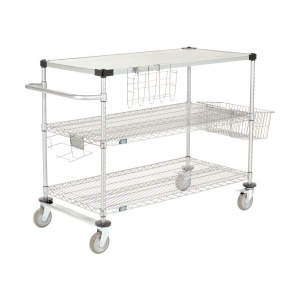 NEXEL® CURBSIDE CART, CHROME, 60"L X 18"W X 43"H, 2 WIRE, 1 SOLID SHELF, PNEUMATIC CASTERS DELIVER YOUR CURBSIDE ORDER MORE EFFICIENTLY. PROVIDES HIGH VISIBILITY AND EASY 4-WAY ACCESS. ALLOWS YOU TO KEEP ONE ORDER, OR MULTIPLE ORDERS READY TO TRANSPORT. TRUCK CONSISTS OF 4 POSTS, 2 WIRE SHELVES, 1 SOLID GALVANIZED SHELF, PLASTIC SHELF CLIPS, DOCUMENT HOLDER, BASKET, PUSH HANDLE, DONUT BUMPERS, TIE BAR, AND PNEUMATIC CASTERS, TWO SWIVEL, TWO RIGID. CHROME GLOVE HOLDER AND OTHER ACCESSORIES SOLD SEPARATELY. POSTS ARE 34"H. TRUCKS FEATURE 8" PNEUMATIC STEM CASTERS WITH A 1200 LB LOAD CAPACITY AND 43" OVERALL HEIGHT. BRIGHT, CHROME OVER NICKEL ELECTRO PLATING CREATES A BRILLIANT HIGH GLOSS FINISH. EASY ASSEMBLY. NSF APPROVED. IN DRY APPLICATION AND USAGE.