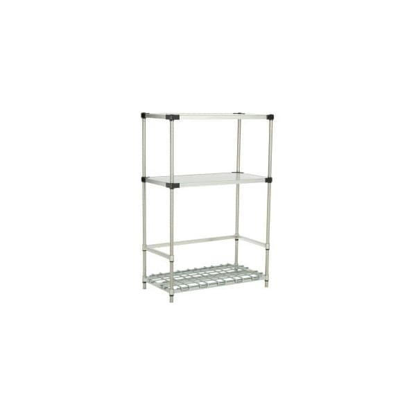 NEXEL® POLY-Z-BRITE® 3-SHELF CONTAINER/KEG RACK W/ 2-SOLID SHELVES, 36"W X 18"D X 63"H CONTAINER RACKS KEEP CONTAINERS AND KEGS ORGANIZED SAVING TIME AND SPACE. RACK PROVIDES STRONG STABLE STORAGE WITHOUT WASTED SPACE. UNIT FEATURES THREE HEAVY DUTY DUNNAGE SHELVES AND TWO REINFORCED THREE-SIDED STEEL FRAMES. TOP WIRE SHELF ALLOWS YOU TO STORE RELATED ACCESSORIES WITHIN REACH. DUNNAGE SHELVES ARE CONSTRUCTED OF 1" SQUARE STEEL TUBING WITH REMOVABLE WIRE DECKING. THREE-SIDED FRAMES ARE CONSTRUCTED OF 1" SQUARE STEEL TUBING. USED WHEN THE STRUCTURAL INTEGRITY OF A SHELF IS DESIRED WITHOUT DECKING.