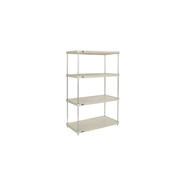 NEXEL® SOLID PLASTIC SHELVING UNIT - CLEAR EPOXY POSTS - 36"W X 18"D X 74"H - 4 SHELF SOLID PLASTIC SHELF STARTER UNIT THESE SHELF UNITS ARE IDEAL FOR DRY STORAGE, FREEZERS AND COOLERS. STARTER UNIT INCLUDES 4 POSTS WITH LEVELING FEET, 4 SOLID PLASTIC SHELVES AND PLASTIC SNAP ON SLEEVES TO SECURE SHELVES TO POSTS. FEATURES: