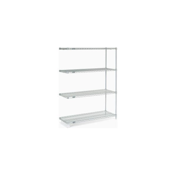NEXELATE® SILVER EPOXY WIRE SHELVING ADD-ON 48"W X 18"D X 63"H ADD-ON SHELVING UNITS ALLOW UNIT EXPANSION TO MAKE THE MOST OF STORAGE SPACE. INCLUDES 2 POSTS WITH LEVELING FEET, 4 SHELVES, SNAP-ON SLEEVES AND S-HOOKS TO JOIN UNITS. NEXELATE® IS AN ATTRACTIVE FINISH THAT CONSISTS OF A SILVER EPOXY POWDER-COAT OVER A RUST INHIBITING UNDERCOAT. NSF APPROVED FOR WET OR DRY USE. FEATURES: