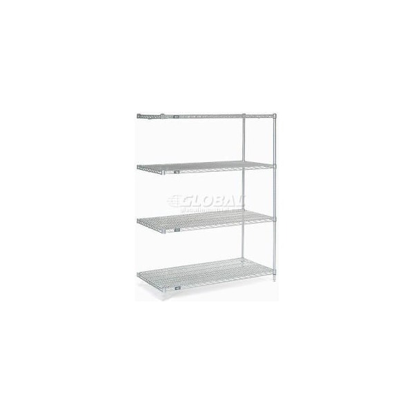 NEXELATE® SILVER EPOXY WIRE SHELVING ADD-ON 48"W X 36"D X 63"H ADD-ON SHELVING UNITS ALLOW UNIT EXPANSION TO MAKE THE MOST OF STORAGE SPACE. INCLUDES 2 POSTS WITH LEVELING FEET, 4 SHELVES, SNAP-ON SLEEVES AND S-HOOKS TO JOIN UNITS. NEXELATE® IS AN ATTRACTIVE FINISH THAT CONSISTS OF A SILVER EPOXY POWDER-COAT OVER A RUST INHIBITING UNDERCOAT. NSF APPROVED FOR WET OR DRY USE. FEATURES: