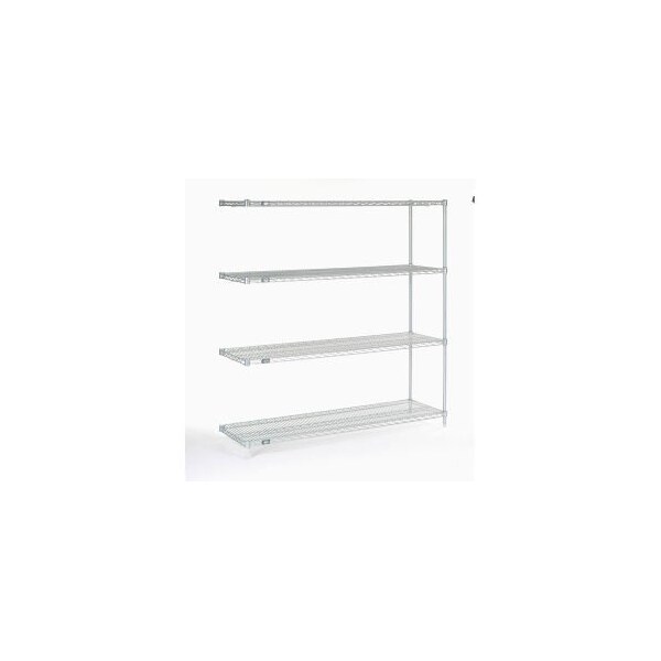 NEXELATE® SILVER EPOXY WIRE SHELVING ADD-ON 60"W X 18"D X 63"H ADD-ON SHELVING UNITS ALLOW UNIT EXPANSION TO MAKE THE MOST OF STORAGE SPACE. INCLUDES 2 POSTS WITH LEVELING FEET, 4 SHELVES, SNAP-ON SLEEVES AND S-HOOKS TO JOIN UNITS. NEXELATE® IS AN ATTRACTIVE FINISH THAT CONSISTS OF A SILVER EPOXY POWDER-COAT OVER A RUST INHIBITING UNDERCOAT. NSF APPROVED FOR WET OR DRY USE. FEATURES: