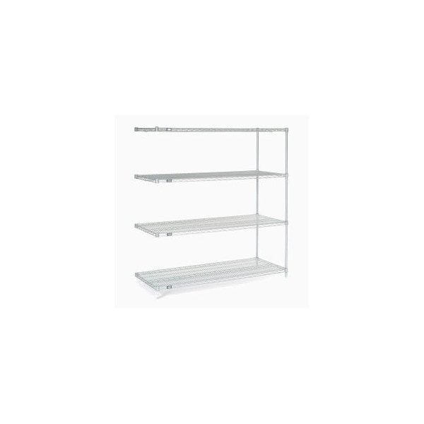 NEXELATE® SILVER EPOXY WIRE SHELVING ADD-ON 60"W X 24"D X 63"H ADD-ON SHELVING UNITS ALLOW UNIT EXPANSION TO MAKE THE MOST OF STORAGE SPACE. INCLUDES 2 POSTS WITH LEVELING FEET, 4 SHELVES, SNAP-ON SLEEVES AND S-HOOKS TO JOIN UNITS. NEXELATE® IS AN ATTRACTIVE FINISH THAT CONSISTS OF A SILVER EPOXY POWDER-COAT OVER A RUST INHIBITING UNDERCOAT. NSF APPROVED FOR WET OR DRY USE. FEATURES: