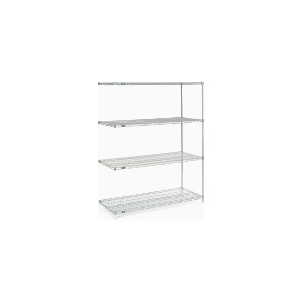 NEXELATE® SILVER EPOXY WIRE SHELVING ADD-ON 60"W X 24"D X 74"H ADD-ON SHELVING UNITS ALLOW UNIT EXPANSION TO MAKE THE MOST OF STORAGE SPACE. INCLUDES 2 POSTS WITH LEVELING FEET, 4 SHELVES, SNAP-ON SLEEVES AND S-HOOKS TO JOIN UNITS. NEXELATE® IS AN ATTRACTIVE FINISH THAT CONSISTS OF A SILVER EPOXY POWDER-COAT OVER A RUST INHIBITING UNDERCOAT. NSF APPROVED FOR WET OR DRY USE. FEATURES: