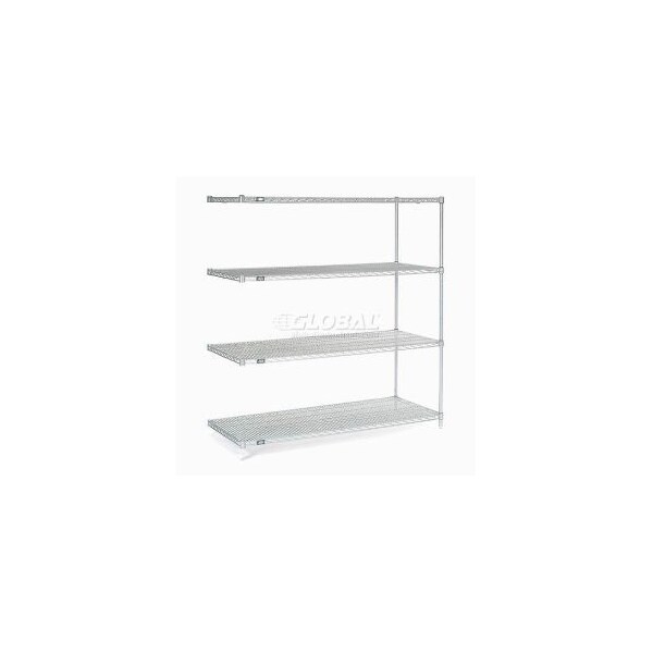 NEXELATE® SILVER EPOXY WIRE SHELVING ADD-ON 60"W X 30"D X 63"H ADD-ON SHELVING UNITS ALLOW UNIT EXPANSION TO MAKE THE MOST OF STORAGE SPACE. INCLUDES 2 POSTS WITH LEVELING FEET, 4 SHELVES, SNAP-ON SLEEVES AND S-HOOKS TO JOIN UNITS. NEXELATE® IS AN ATTRACTIVE FINISH THAT CONSISTS OF A SILVER EPOXY POWDER-COAT OVER A RUST INHIBITING UNDERCOAT. NSF APPROVED FOR WET OR DRY USE. FEATURES: