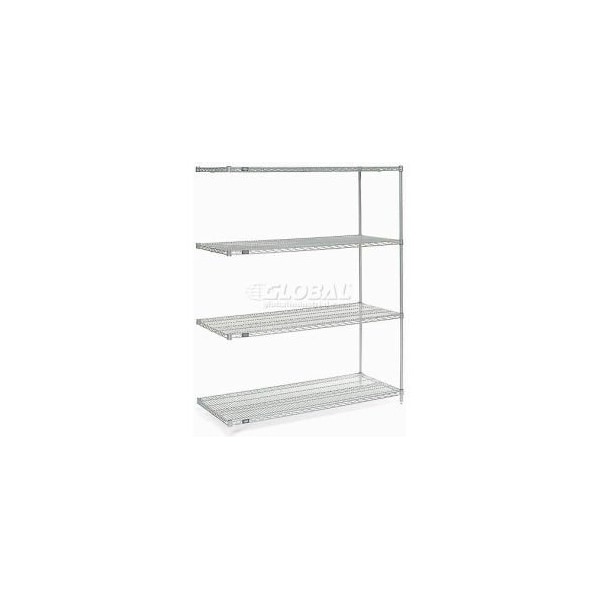NEXELATE® SILVER EPOXY WIRE SHELVING ADD-ON 60"W X 36"D X 74"H ADD-ON SHELVING UNITS ALLOW UNIT EXPANSION TO MAKE THE MOST OF STORAGE SPACE. INCLUDES 2 POSTS WITH LEVELING FEET, 4 SHELVES, SNAP-ON SLEEVES AND S-HOOKS TO JOIN UNITS. NEXELATE® IS AN ATTRACTIVE FINISH THAT CONSISTS OF A SILVER EPOXY POWDER-COAT OVER A RUST INHIBITING UNDERCOAT. NSF APPROVED FOR WET OR DRY USE. FEATURES: