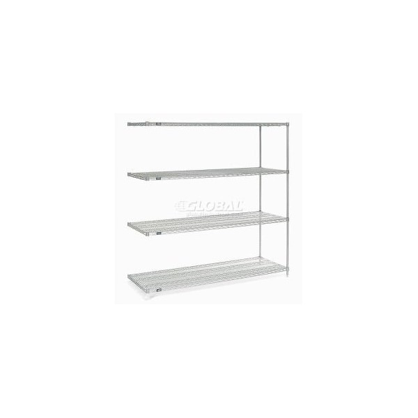 NEXELATE® SILVER EPOXY WIRE SHELVING ADD-ON 72"W X 30"D X 74"H ADD-ON SHELVING UNITS ALLOW UNIT EXPANSION TO MAKE THE MOST OF STORAGE SPACE. INCLUDES 2 POSTS WITH LEVELING FEET, 4 SHELVES, SNAP-ON SLEEVES AND S-HOOKS TO JOIN UNITS. NEXELATE® IS AN ATTRACTIVE FINISH THAT CONSISTS OF A SILVER EPOXY POWDER-COAT OVER A RUST INHIBITING UNDERCOAT. NSF APPROVED FOR WET OR DRY USE. FEATURES: