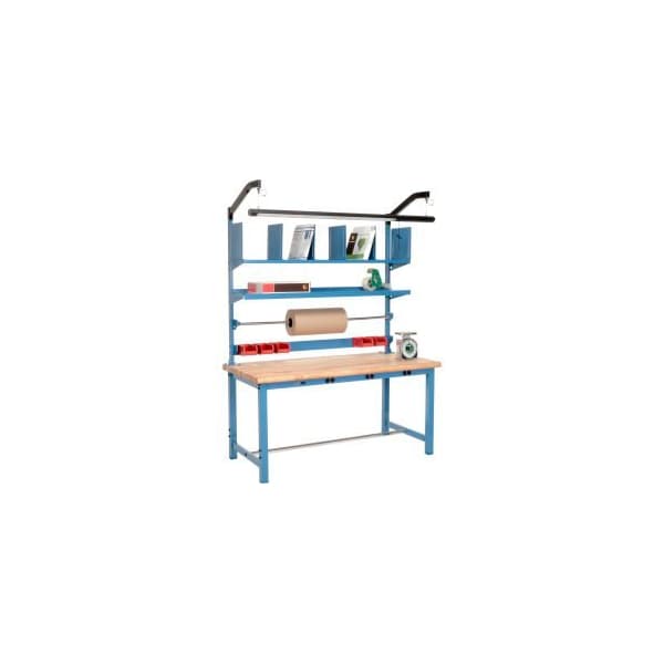 THIS ELECTRIC PACKING WORKBENCH ALSO INCLUDES A POWER APRON AND RISER KIT. THIS WORKBENCH FEATURES 1-3/4" THICK MAPLE SAFETY EDGE TOP SUPPORTED BY HEAVY-DUTY 2" SQUARE 14 GA STEEL TUBULAR LEGS THAT ADJUST FROM 28 - 34"H AT 2" INCREMENTS AND ARE TESTED TO 5000 LBS CAPACITY, ENSURING THE WEIGHT IS EVENLY DISTRIBUTED. IT INCLUDES ADJUSTABLE LEVELLING FLOOR GLIDES AND LEVELLING FOOT PLATES THAT ALLOW FLOOR ANCHORING. THIS WORKBENCH HAS A POWDER COAT FINISH, AND IT IS QUICK AND EASY TO ASSEMBLE. PRE-WIRED POWER APRON INCLUDES 3 DUPLEX 15A/115V OUTLETS, CIRCUIT BREAKER, AND 13L QUICK-DISCONNECT POWER CORD. THE RISER KIT INCLUDES 48"H UPRIGHTS, BIN RAIL, REEL HOLDER, TWO 12" DEPTH SHELVES (1 WITH 6 ADJUSTABLE CARTON DIVIDERS), AND A 72"W LED LIGHT KIT.