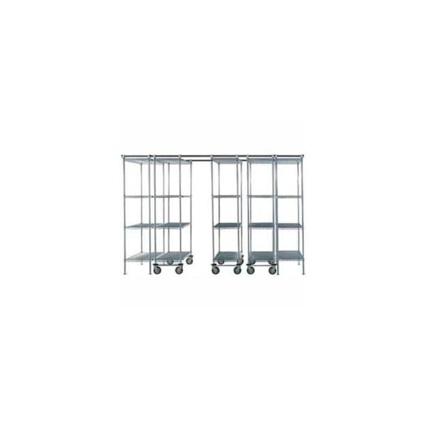 SPACE-TRAC 5 UNIT STORAGE SHELVING POLY-Z-BRITE 48"W X 24"D X 86"H - 14 FT. SPACE-TRAC HIGH DENSITY MOBILE STORAGE POLY-Z BRITE 5-UNIT SHELVING SYSTEM HIGH DENSITY MOBILE STORAGE SYSTEMS HELP YOU DOUBLE YOUR STORAGE CAPACITY USING MINIMAL SPACE. THESE UNIQUE OVERHEAD TRACK SYSTEMS PROVIDE INSTANT ACCESS TO INVENTORY WHILE FREEING FLOOR SPACE AND INCREASING THE NUMBER OF SHELVING UNITS USED IN A DESIGNATED AREA. IDEAL FOR DRY STORAGE, COOLERS AND WALK-IN FREEZERS. UTILIZES 2 STATIONARY UNITS; ONE ON EACH END, CONNECTED WITH AN OVERHEAD TRACK THAT ALLOWS MOBILE SHELVING UNITS IN BETWEEN TO SMOOTHLY SHIFT SIDE-TO-SIDE FOR EASY ACCESS TO INVENTORY AND STOCK ITEMS. INCLUDES TWO 12'L OVERHEAD STAINLESS STEEL TRACKS. GUIDE TRACKS CONNECT UNITS TOGETHER FOR AN EASY SLIDE-ALONG TRACK SHELVING SYSTEM. 4 HEIGHT ADJUSTABLE SHELVES ON EACH SHELVING UNIT FEATURES AN OPEN WIRE DESIGN FOR AIR, LIGHT AND SPRINKLER PENETRATION WHILE MINIMIZING DUST ACCUMULATION. SHELVES ADJUST AT 1" INCREMENTS. EACH MOBILE UNIT INCLUDES (4) 5" POLYURETHANE CASTERS. POLY-Z-BRITETM OFFERS A 10-YEAR LIMITED AGAINST RUST. MADE WITH A POWDER-EPOXY OVER ZINC-CHROMATE ELECTROPLATING. POLY-Z RESEMBLES THE LOOK OF CHROME, BUT HANDLES EXTREME TEMPERATURES AND MOISTURE. ASSEMBLY REQUIRED.
