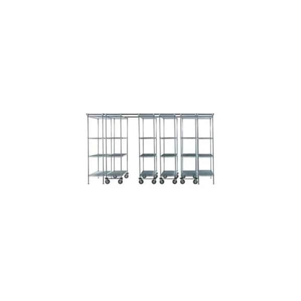 SPACE-TRAC 6 UNIT STORAGE SHELVING POLY-Z-BRITE 72"W X 21"D X 74"H - 14 FT. SPACE-TRAC HIGH DENSITY MOBILE STORAGE POLY-Z BRITE 6-UNIT SHELVING SYSTEM HIGH DENSITY MOBILE STORAGE SYSTEMS HELP YOU DOUBLE YOUR STORAGE CAPACITY USING MINIMAL SPACE. THESE UNIQUE OVERHEAD TRACK SYSTEMS PROVIDE INSTANT ACCESS TO INVENTORY WHILE FREEING FLOOR SPACE AND INCREASING THE NUMBER OF SHELVING UNITS USED IN A DESIGNATED AREA. IDEAL FOR DRY STORAGE, COOLERS AND WALK-IN FREEZERS. UTILIZES 2 STATIONARY UNITS; ONE ON EACH END, CONNECTED WITH AN OVERHEAD TRACK THAT ALLOWS MOBILE SHELVING UNITS IN BETWEEN TO SMOOTHLY SHIFT SIDE-TO-SIDE FOR EASY ACCESS TO INVENTORY AND STOCK ITEMS. INCLUDES TWO 12'L OVERHEAD STAINLESS STEEL TRACKS. GUIDE TRACKS CONNECT UNITS TOGETHER FOR AN EASY SLIDE-ALONG TRACK SHELVING SYSTEM. 4 HEIGHT ADJUSTABLE SHELVES ON EACH SHELVING UNIT FEATURES AN OPEN WIRE DESIGN FOR AIR, LIGHT AND SPRINKLER PENETRATION WHILE MINIMIZING DUST ACCUMULATION. SHELVES ADJUST AT 1" INCREMENTS. EACH MOBILE UNIT INCLUDES (4) 5" POLYURETHANE CASTERS. POLY-Z-BRITETM OFFERS A 10-YEAR LIMITED AGAINST RUST. MADE WITH A POWDER-EPOXY OVER ZINC-CHROMATE ELECTROPLATING. POLY-Z RESEMBLES THE LOOK OF CHROME, BUT HANDLES EXTREME TEMPERATURES AND MOISTURE. ASSEMBLY REQUIRED.