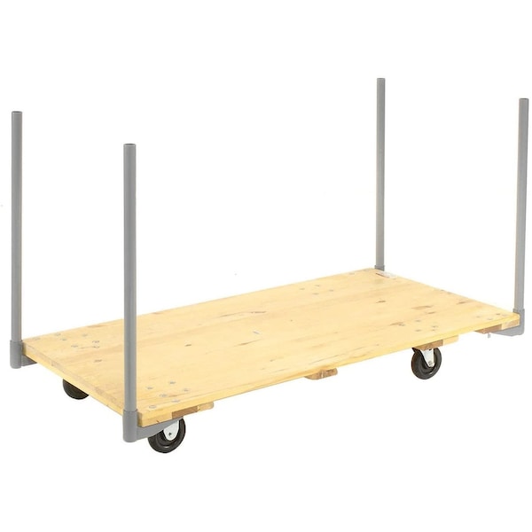 STAKE HANDLE HARDWOOD DECK PLATFORM TRUCK 60 X 30 1000 LB. CAPACITY 5" POLYURETHANE CASTERS - 241700 SUPERIOR PERFORMANCE AT AFFORDABLE PRICES. FLUSH 7/8" THICK, KILN-DRIED AND SEALED DECK IS REINFORCED WITH CROSS BATTENS FOR LONG LIFE. STAKE HANDLE MODELS COME COMPLETE WITH FOUR 30"H REMOVABLE PIPE STAKES. ROLL SMOOTHLY ON 2 SWIVEL, 2 RIGID CASTERS.
