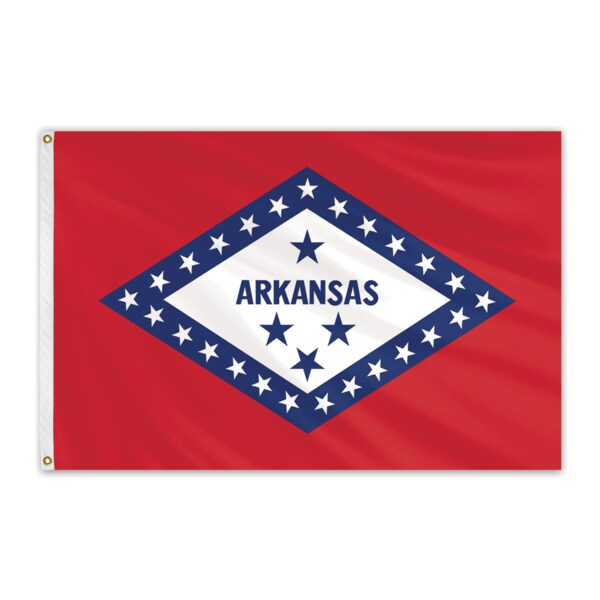 Unsurpassed in beauty and craftsmanship, these nylon outdoor flags are manufactured to precise specifications. Expertly crafted using 100% heavyweight, 200-denier nylon bunting, and treated to resist sun and chemical deterioration. Extremely durable and fast drying, nylon flags are the most popular choice for outdoor flags. All nylon flags are finished with a strong, durable snow-white header and brass grommets. The Arkansas state flag was adopted on March 16th, 1924 and has meaningful history behind it's creation. The 25 stars around the diamond signify that Arkansas was the 25th state to join. The diamond represented the first diamond mine discovered in the U.S at the time, and the three stars below the state name represent the three nations to which the state belonged.